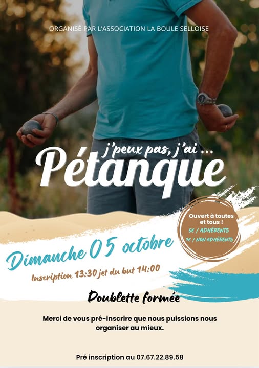 La boule Selloise organise un concours de pétanque en doublette le dimanche 05 octobre prochain sur le Terra, au bout de la Rue des Moissons.