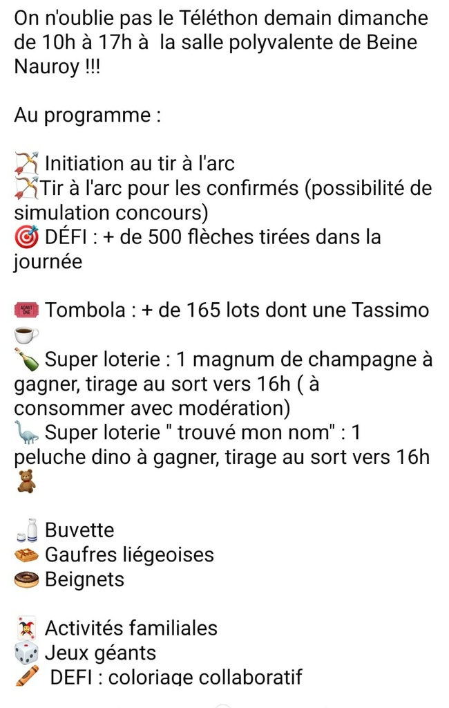 Dans le cadre du Téléthon 2025, la section "tir à l'arc" du CAB de Beine-Nauroy vous propose plusieurs animations au profit du Téléthon :