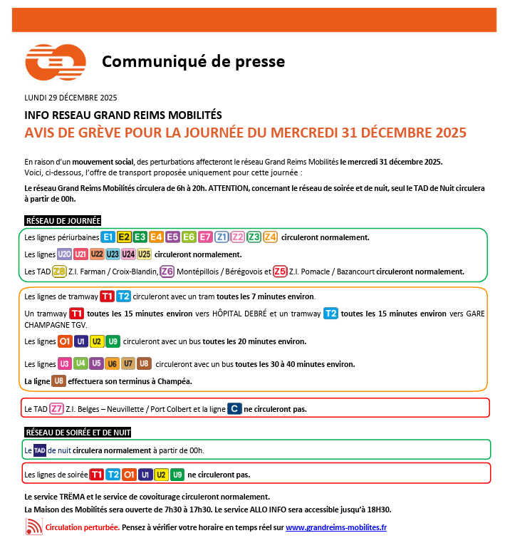 Les services "Grand Reims Mobilités" nous informent qu'un avis de grève a été déposé pour la journée du mercredi 31 décembre 2025.