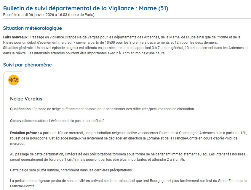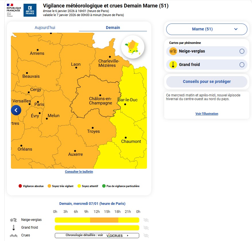 Météo France place le département de la Marne en vigilance orange "neige/verglas" à compter de demain 07/01/2026 de 10h00 à 18h00.
